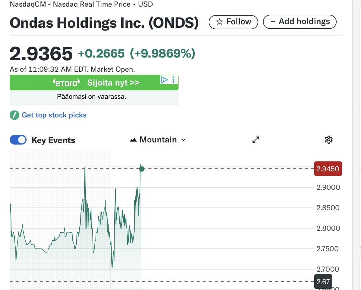 Ondas Holdings (ONDS) today on a declining stock market with a mild rise of about ten percent. I acquired 6000 units last Wednesday, which I did announce promptly then on the bought/sold board. In less than a week, a 55 percent rise in the drone company. Congratulations to co-owners!