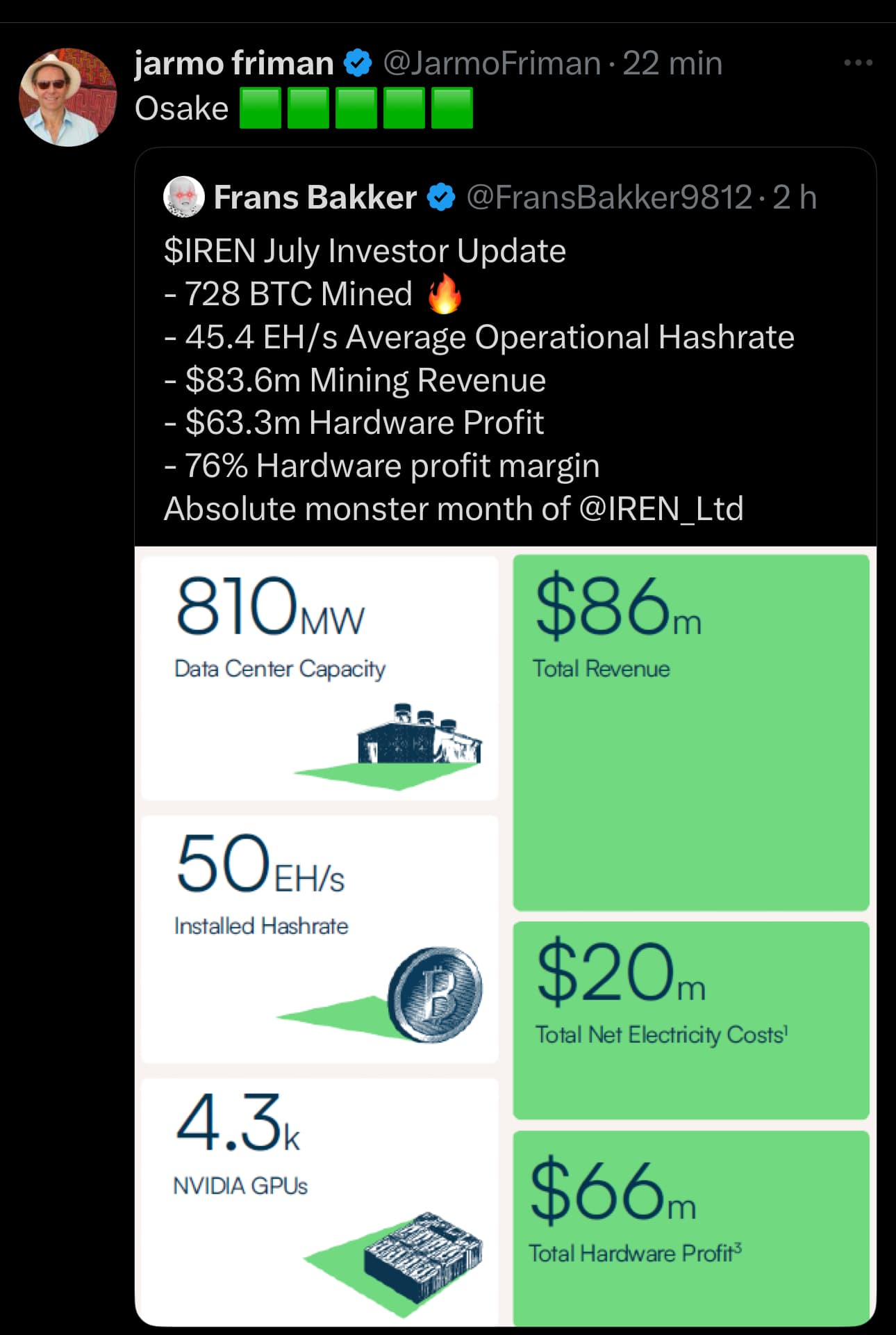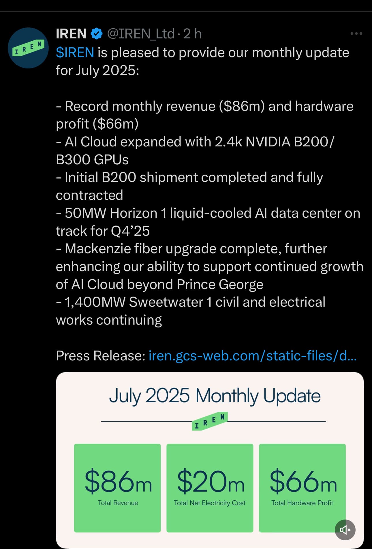 Salkun neljänneksi suuri positio $IREN tykittää kuukausipäivityksensä jälkeen. Oli jo +10 % nousussa, jolloin kurssi kävi 18,21 USD tasolla.
