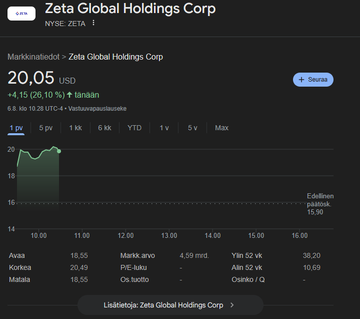 Zeta Global julkaisi eilen osavuosikatsauksen, joka ylitti analyytikoiden ennusteet sekä oman ohjeistuksen. Samalla tämän vuoden ohjeistusta nostettiin. Markkina otti tämän iloisesti vastaan: