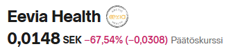 Endnu et finsk selskab forlader børsen - Eevia Health og der er IKKE tale om et købstilbud, men om at pengene løb tør. Eevia Health er noteret på den svenske Spotlight-børs, men driften og hovedkontoret er i Finland.