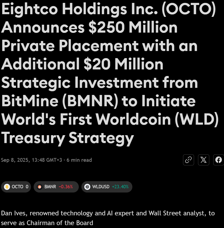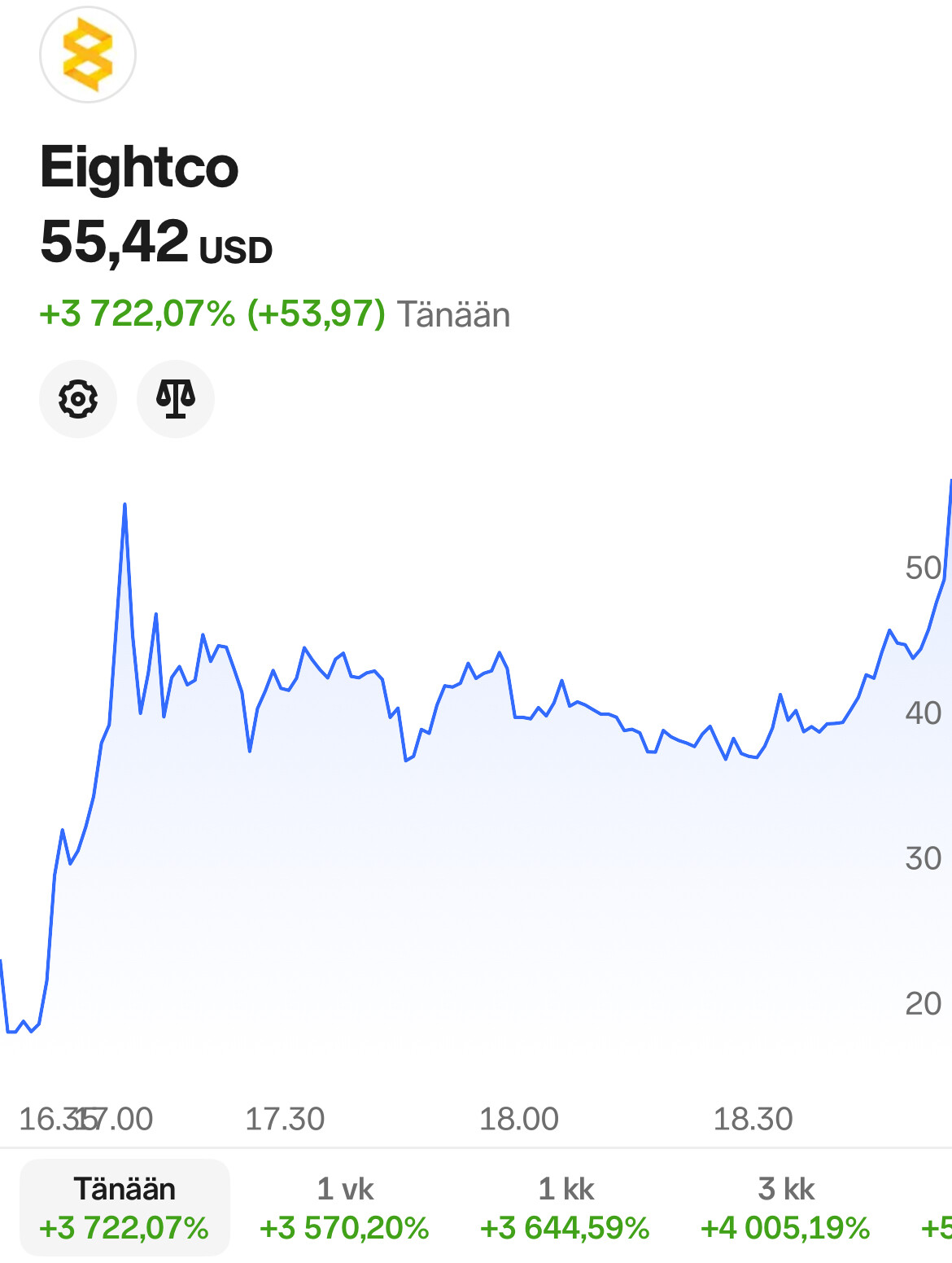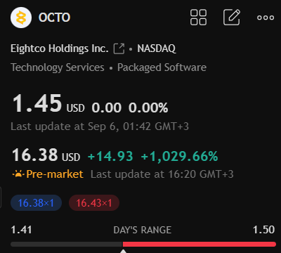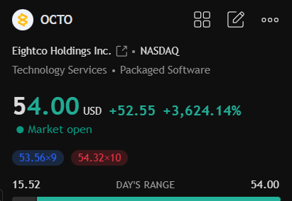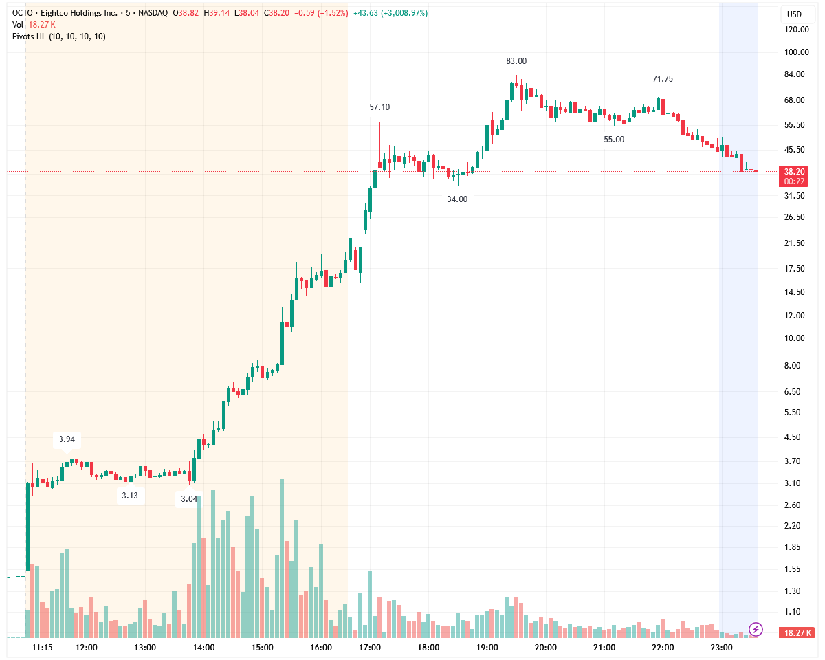 Olikin melko harvinainen tapaus, kun OCTO saavutti parhaimmillaan +5500% edellisen päivän päätöksestä. Tuossa on mielenkiintoista, että huomattava osa vaihdosta tapahtui jo pre-marketissa. Kaaviossa on mukana pre-market/post-market omilla taustoilla. En ole varma onko noiden vaihtopalkkien skaalaus ihan kohdallaan, kun TV silti ilmoittaa screenerissä, että suurin osa vaihdosta oli normaalissa kaupankäynnissä. Onkohan muuten tänä vuonna ollut yhtään isompaa nousua yhden päivän sisällä? Verrokkina tuli nyt ainakin mieleen BMNR, joka aiemmin heinäkuun alussa saavutti +3700% tosin neljän päivän aikana. Sivuhuomiona linkitetään tähän vielä Jeppezin kommentti.