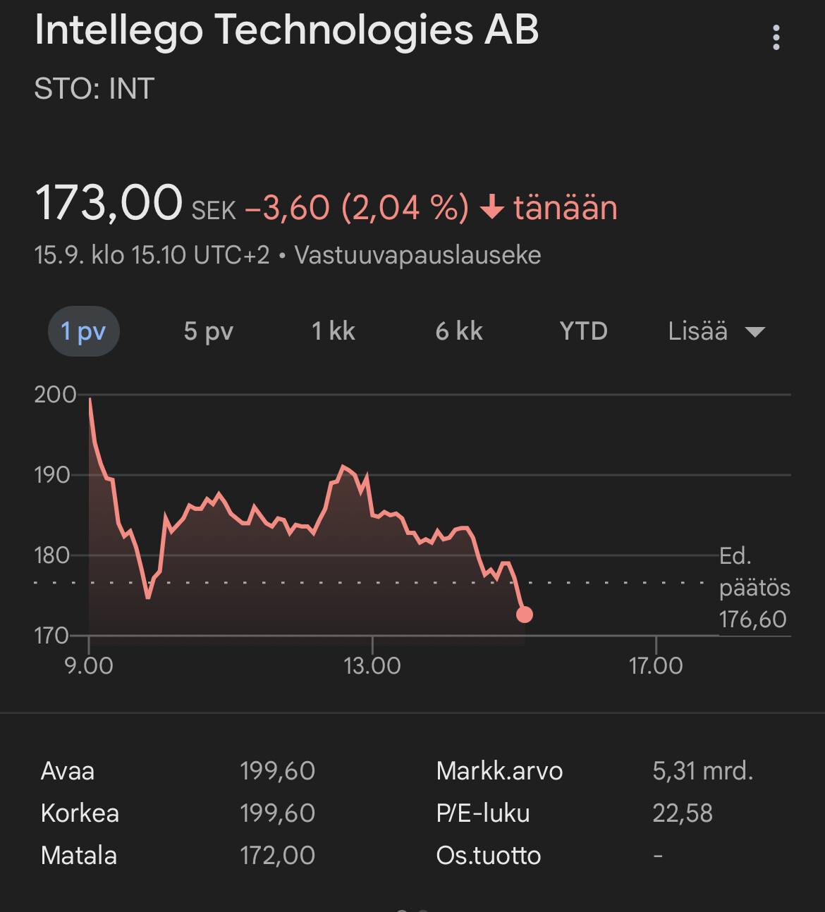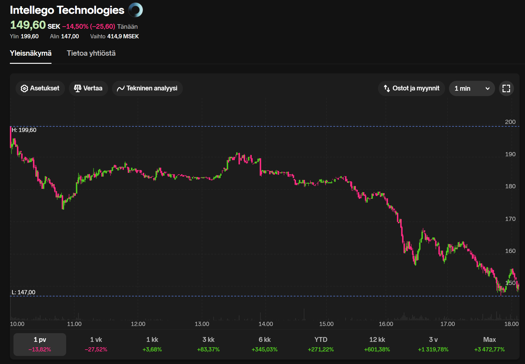 Vaikka pörssi ei kiinni vielä olekaan niin onhan Intellegon osake mennyt pari viime päivää kovaa suuntaan ja toiseen. Niin myös tänään
