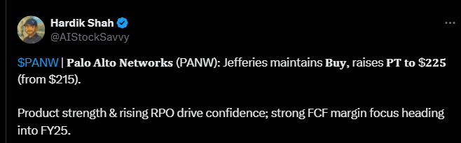 Palo Alto received a ‘buy’ recommendation from Jefferies and a price target increase to $225 due to strong product demand, a growing order backlog, and good cash flow prospects.