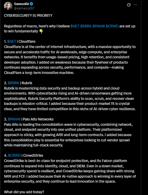 Below is a slightly more comprehensive tweet, which highlights, among other things, how CrowdStrike stands out in the cybersecurity market because its Falcon platform is genuinely unified and real-time, unlike competitors who have “partial” or otherwise passive solutions. Its competitors, such as SentinelOne, Palo Alto Networks, and Wiz, offer partial solutions, but not comparable comprehensive protection, etc.
