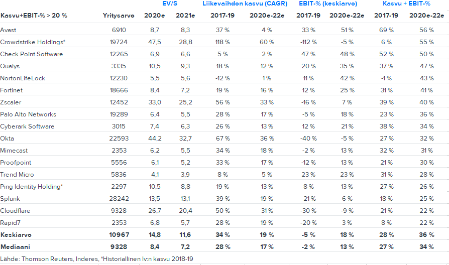 I was surprised how the forum has embraced many attractive hypes; there’s the hydrogen business, Nikolas and others - but nothing is said about cybersecurity. In Finland, Nixu, F-Secure, and SSH are pure cyber companies. However, they don’t even come close to the figures of their foreign counterparts, and for this reason, it’s worth looking at the situation from across the pond, for example. It was nice to notice that the InderesPod cybersecurity episode also dedicated some time to these foreign companies.