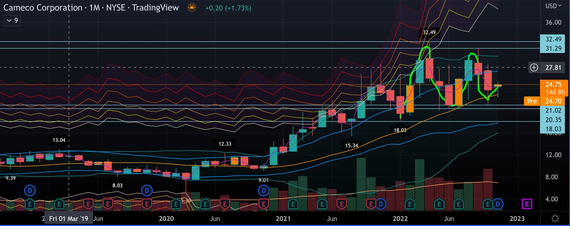CCJ on muodostanut monthly EQ:n, jonka sisällä yrittää weekly trend changea. Vahvistaisi monthly HL:n.