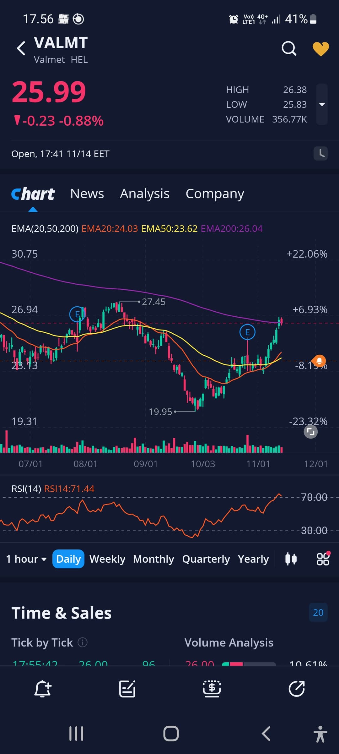 Tämän vuoden volume POC on 24.83 eli juuri siinä, missä nyt treidataan. Sen alapuolelle meno on aina huono merkki. Tärkeä tukitaso 24.05, koska se on samalla myös weekly support.