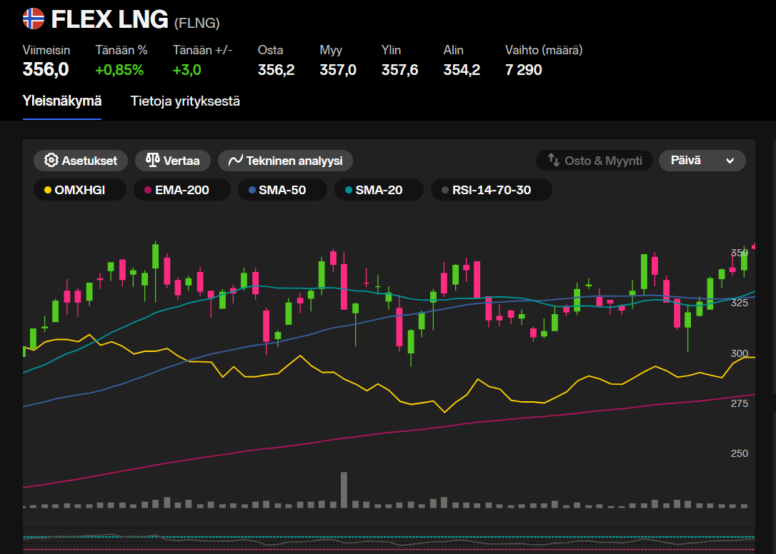 FLNG näyttää daily kuvaajalla varovaista irtiottoa tuosta 300 - 350 kanavasta. Näkeekö TA velhot tässä jotain muita Bull-indikaattoreita?