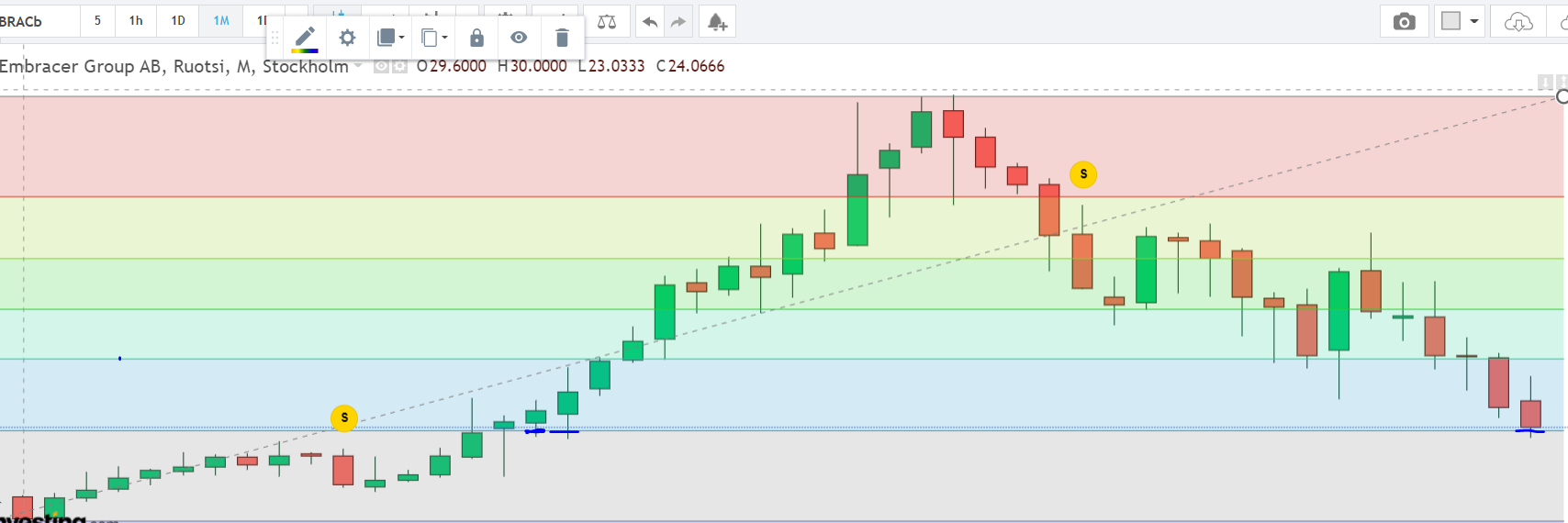Kurssi vajoaa painovoiman vetämänä toistaiseksi, eikä sille löydy enää supporttia (ollaan jo vuodessa ennen 2021 kurssin osalta). Käänne tapahtuu fundan kautta, jos tapahtuu. Tuskin ennen osaria tapahtuu mitään isompaa fundan puolella.