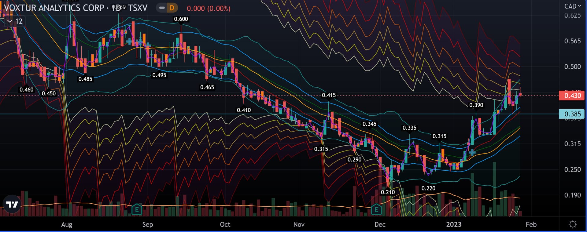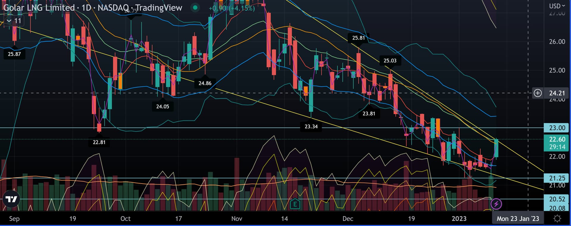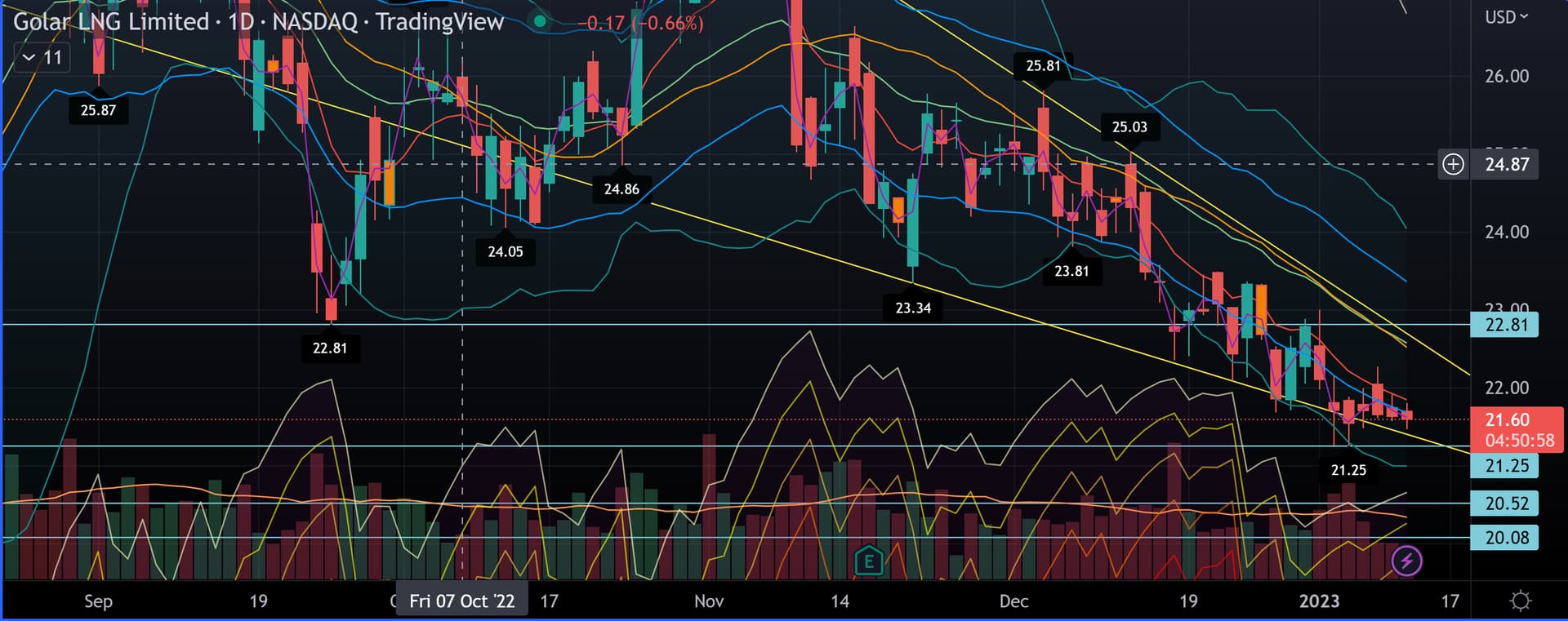 Ei mitenkään tyypillinen daily chart. Monthly kertoo, että LH on tehty ja haetaan HL:ää. Weekly consolidation ja dailystä näkee, miten 39-40 alue on muodostunut vahvaksi vastusalueeksi. Tämä kulminoitui 9.1. (liekö viikonloppuna tullut jotain sisäpiiritietoa jollekin), jolloin alkoi myynti, mikä kulminoitui 11.1. (suurin bear volume päivä sitten 11/2021). Myynti jatkui vielä 12.1.