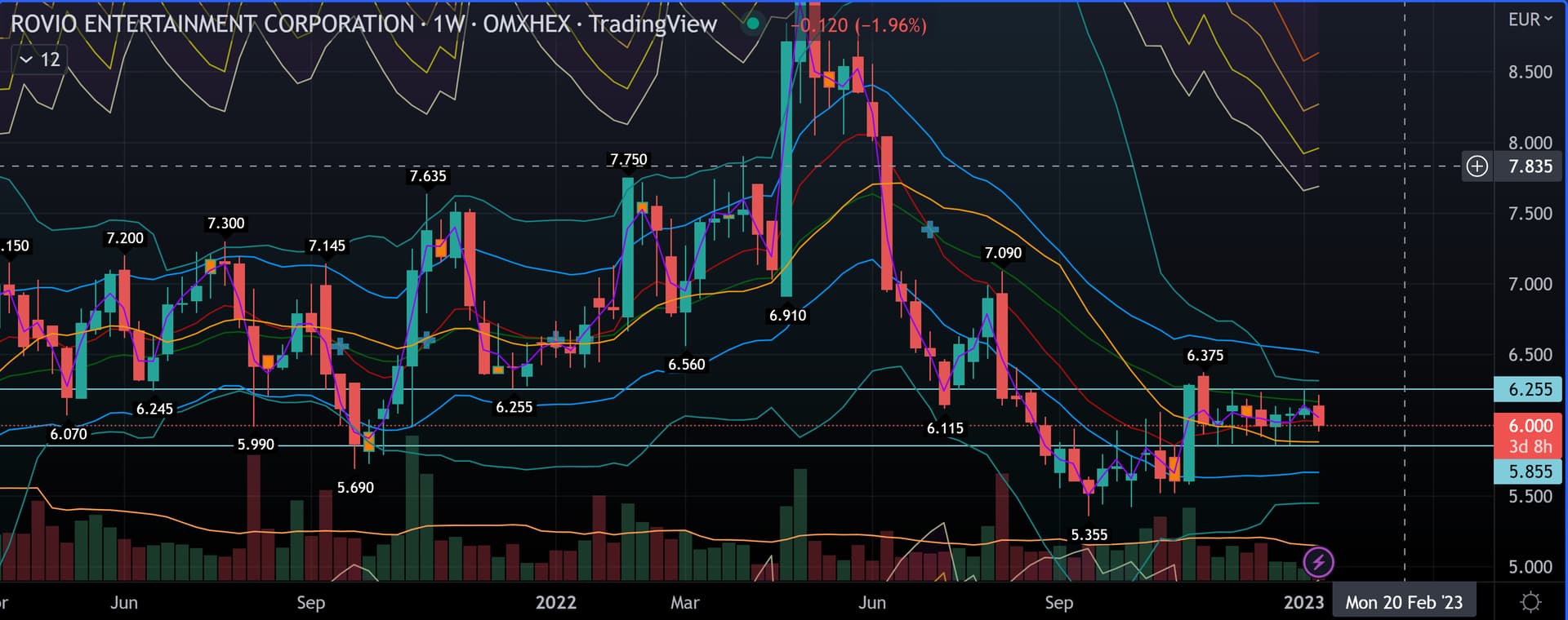 Onkohan täällä tapahtumassa jotakin, viikkotason käyrät tässä, taisikin antaa päivätason: ROVIO ENTERTAINMENT OYJ : Technical Analysis Chart | ROVIO | FI4000266804 | MarketScreener