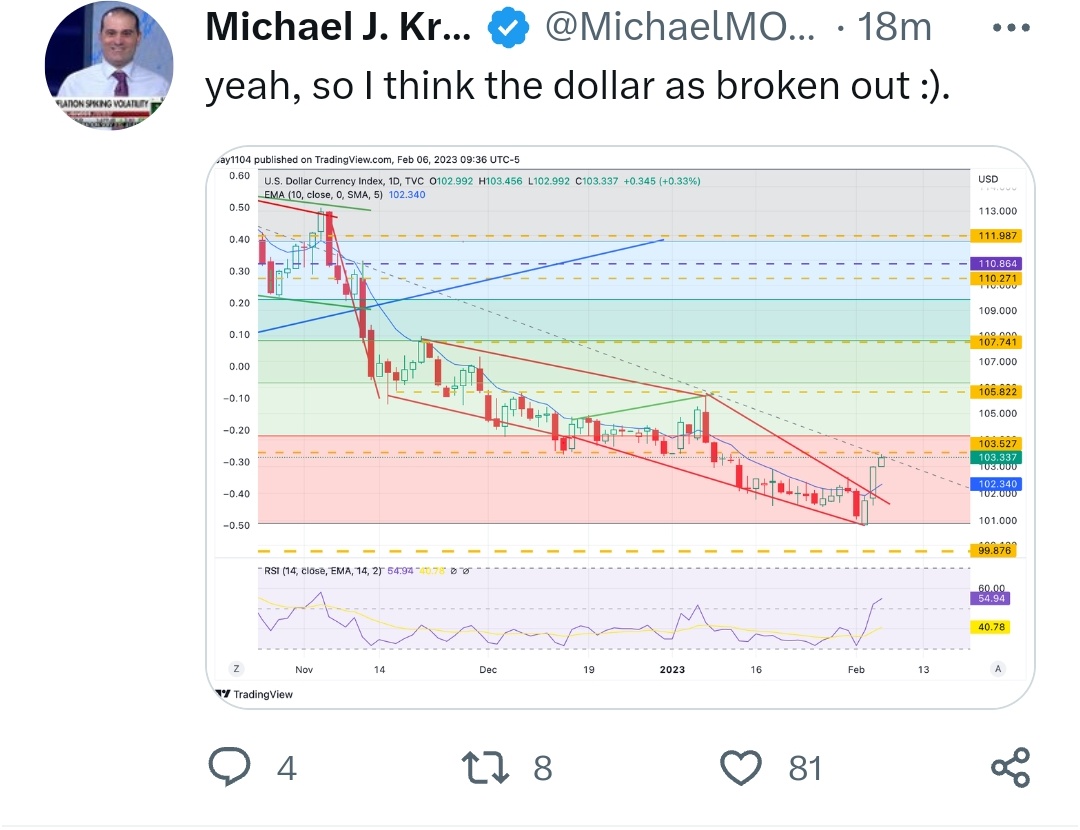 Hvad mener @DayTraderXL om dette, og følger du selv dollarens bevægelser? Man skulle tro, det er en ret væsentlig ting for retningen på de amerikanske aktier.