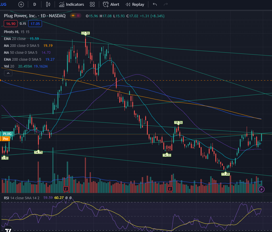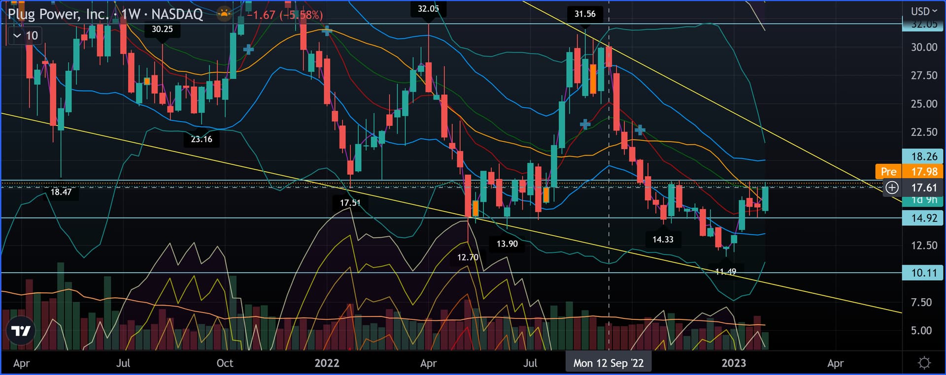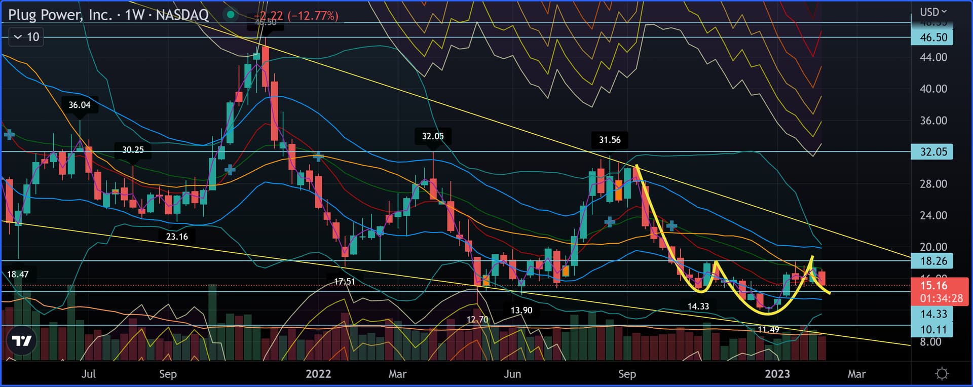 PLUG: Der blev ganske rigtigt lavet en daglig nedadgående trend, som udviklede sig til et ugentligt bull flag. Den banker nu på LH 18.13-niveauet, med 18.26 lige bagved. Jeg havde selv håbet på, at den ville have lavet en ugentlig iHS (omvendt hoved-skulder), men hvis den stiger direkte herfra, er det ikke længere aktuelt. “Helt sikkert”, hvis markedet stiger, følger PLUG med.
