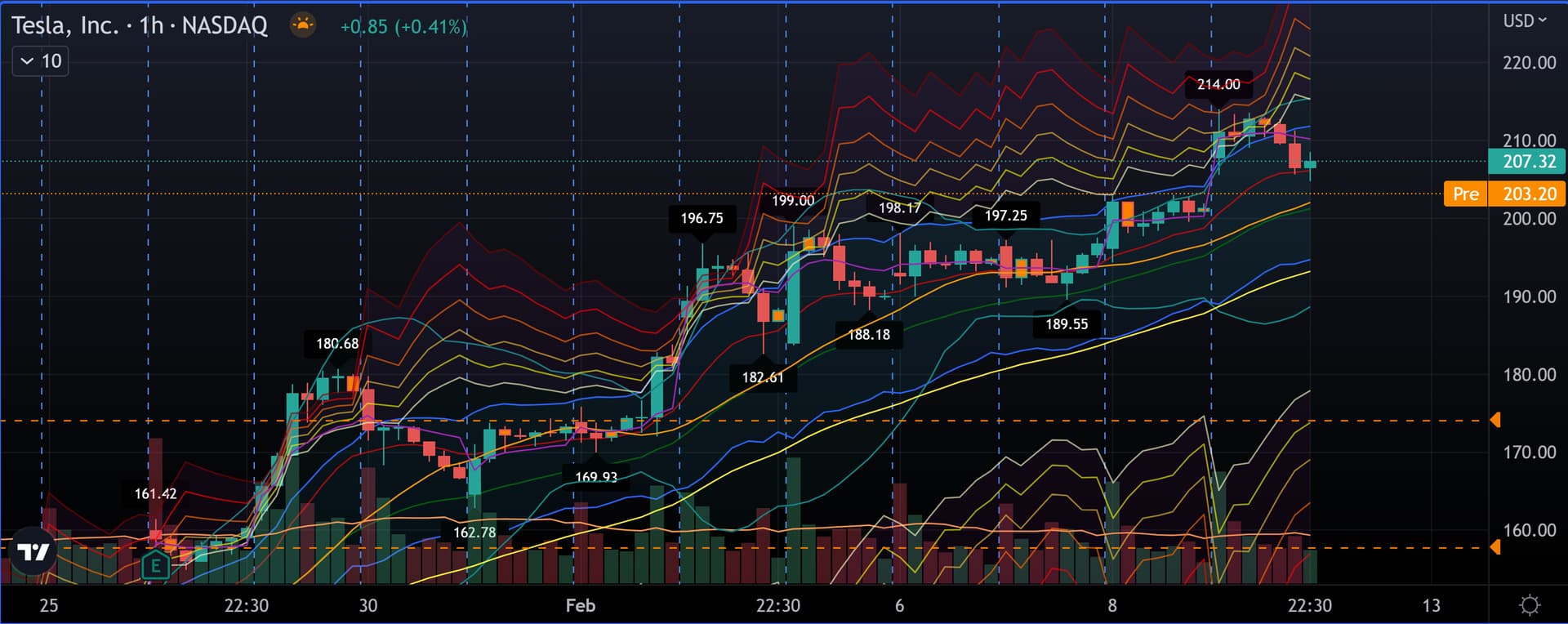 I går var TSLA en af de stærkeste tech-aktier, så man bør indtil videre være forsigtig med shorts. Et 1H trendskifte (ned) ville være ideelt, således at en LH blev dannet under gårdsdagens high på 214. Stop over det.