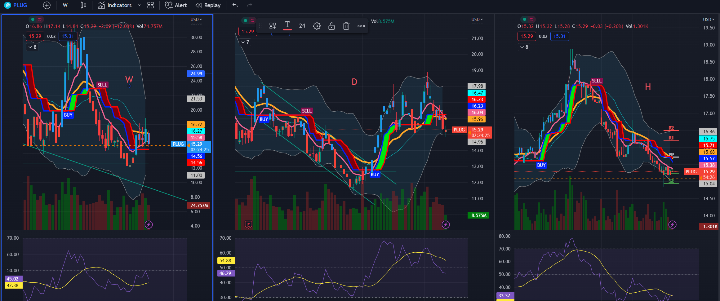 Det ser skidt ud i mine grafer. Der kom aldrig et købssignal på Weekly, på Daily sker der muligvis igen en EMA8/15-inversion (lyserød og gul linje på mit billede) i den forkerte retning (afhængigt af dagens lukning), og Hourly er katastrofal. Det er en lang ventetid, før Plug begynder at tjene penge.