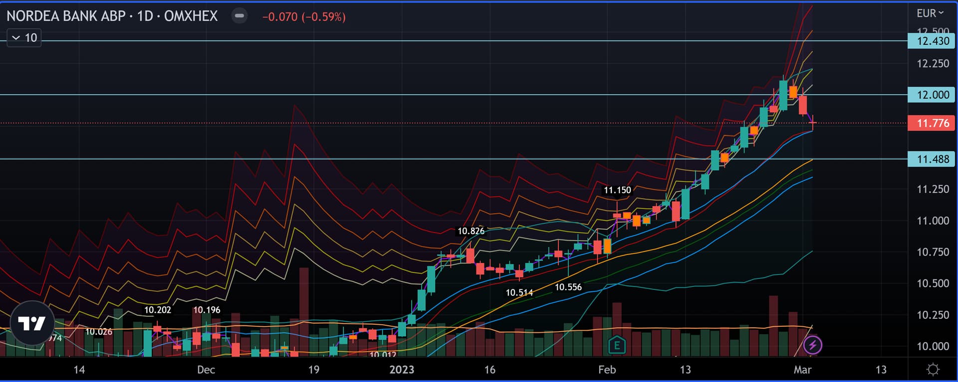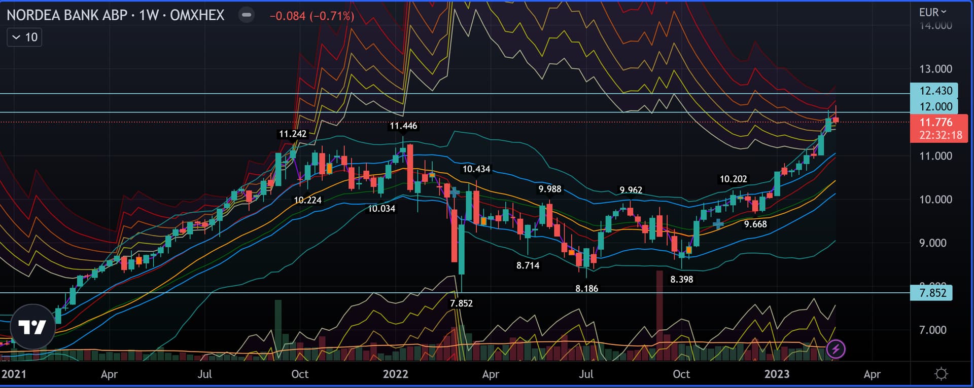 Kunne man få lidt TA-indsigt i Nordea fra nogen? Fra både funda- og TA-siden virker det som en ret god case i øjeblikket, men vi banker snart på ATH-niveauer, og jeg overvejer, hvad man egentlig bør gøre med de nuværende positioner.