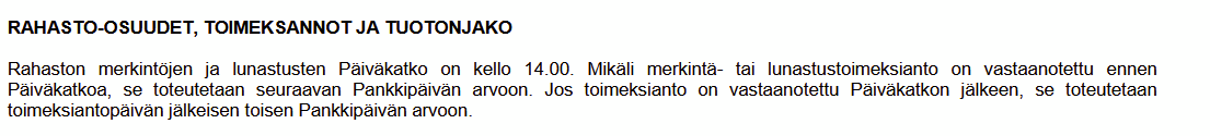 Tässäkin tapauksessa vastaus löytyy rahaston papereista. Katsoppa rahastosi säännöt, sieltä löytyy vastaus. Alla esimerkki yhdestä vastaavasta (OP:n Aasia-indeksi), mutta nuo cut-off ajat ja toteutusviiveet voi vaihdella rahastoissa paljonkin.