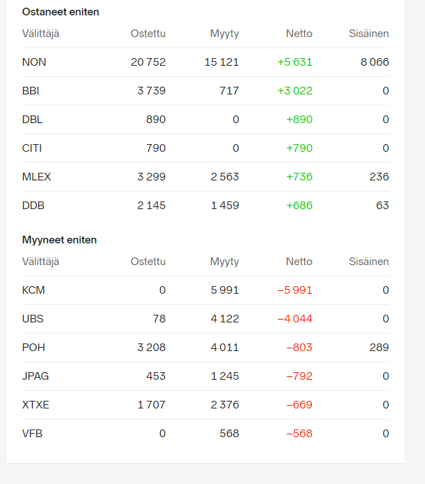 Mistä katsotte osakkeiden ostot/myynnit? Esim joku rahasto myynyt 10000 jotain osaketta ja vaikka nordnet ostanut srn 10000. Suomi-osakkeet riittää.