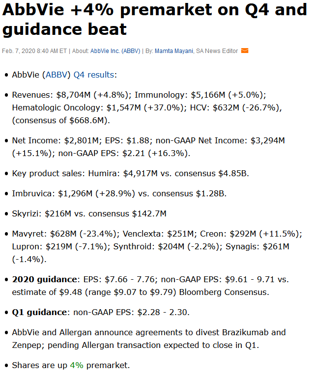 Abbvie esitti jälleen komeat luvut päättyneeltä vuodelta, samoin hyvät näkymät tälle vuodelle. Kurssireaktio lienee tänään melko muikea, ottaen huomioon NYSEn punaiseen päin valuvan perusvärin.