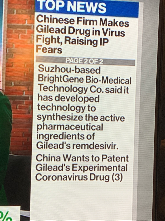 Suzhoussa toimiva BrightGene Bio-Medical Technology Co. kertoi kehittäneensä teknologian Gileadin remdesiviirin vaikuttavien lääkeaineiden (active pharmaceutical ingredients) syntetisoimiseksi. Lääke on johtava ehdokas yli 1 000 ihmistä tappaneen viruksen hoidossa, mutta sitä ei ole lisensoitu tai hyväksytty missään päin maailmaa. BrightGenen osake nousi Shanghaissa 20 % keskiviikkona.