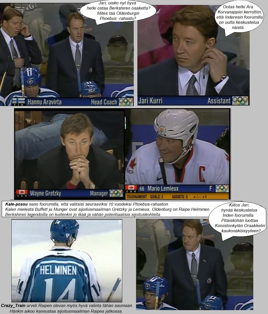 Ilman muuta Buffett ja Munger ovat valtavan paljon suurempia sijoittajia kuin Oldenburg. He ovat sijoitusmaailman Gretzky ja Lemieux, Oldenburg on Raipe Helminen. Mutta ymmärsin että puhe oli siitä, kumpaan kannattaisi mieluummin sijoittaa nyt, ja silloin viimeisten 20 vuoden vertailu on relevanttia. Kuten mainitsit, Berkshirellä on hyvin kapea potentiaalisten kohteiden kori, mikä on haitannut heitä tällä vuosituhannella. Tilanne on vain vaikeutunut. Lisäksi legendoilla alkaa olla ikää. Näistä s…