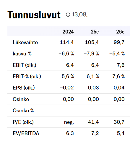 Oot oikeassa että yhtiöiden näkökulmasta on vaikea kohentaa kannattavuutta liikevaihdon laskiessa, mutta Lamorilla on menossa mittava 8 MEUR:n kustannussäästöihin tähtäävä tehostamisohjelma, joka on tuon ennakoidun kehityksen taustalla. Sen lisäksi odotan liikevaihdon rakenteen paranevan, mikä tukee suhteellista kannattavuutta. Q3:llahan ebit-% nousi viime vuodesta liikevaihdon merkittävästä pudotuksesta huolimatta. Toki myönnän sen että ennustamisen osalta muovin kemiallinen kierrätysliiketoiminta on varhaisen kehitysvaiheensa takia se kaikista haastavin osuus ennakoida ja se jos joku voi aiheuttaa erotuksia mun ennusteisiin.