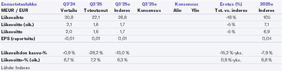 Lamorin Q3-liikevaihto jäi odotuksistamme, mutta liiketulos oli linjassa ennusteisiimme vahvan suhteellisen kannattavuuden tukemana. Raportin yhteydessä yhtiö päivitti arviotaan Kilpilahden muovin kemiallisen kierrätyslaitoksen kokonaisinvestoinnista 60-70 MEUR:oon (aik. 50-60 MEUR). Raportin vaisun tilauskertymän perusteella näemme laskupainetta lähivuosien ennusteissamme, joskin investointiennusteissamme on nousupainetta. Päivitämme ennusteemme ja näkemyksemme yhtiöstä poikkeuksellisesti maanantaiksi kuultuamme yhtiön tulosesityksen. Lamorin tulosesitys järjestetään tänään kello 10.00, ja sitä voi seurata täältä.