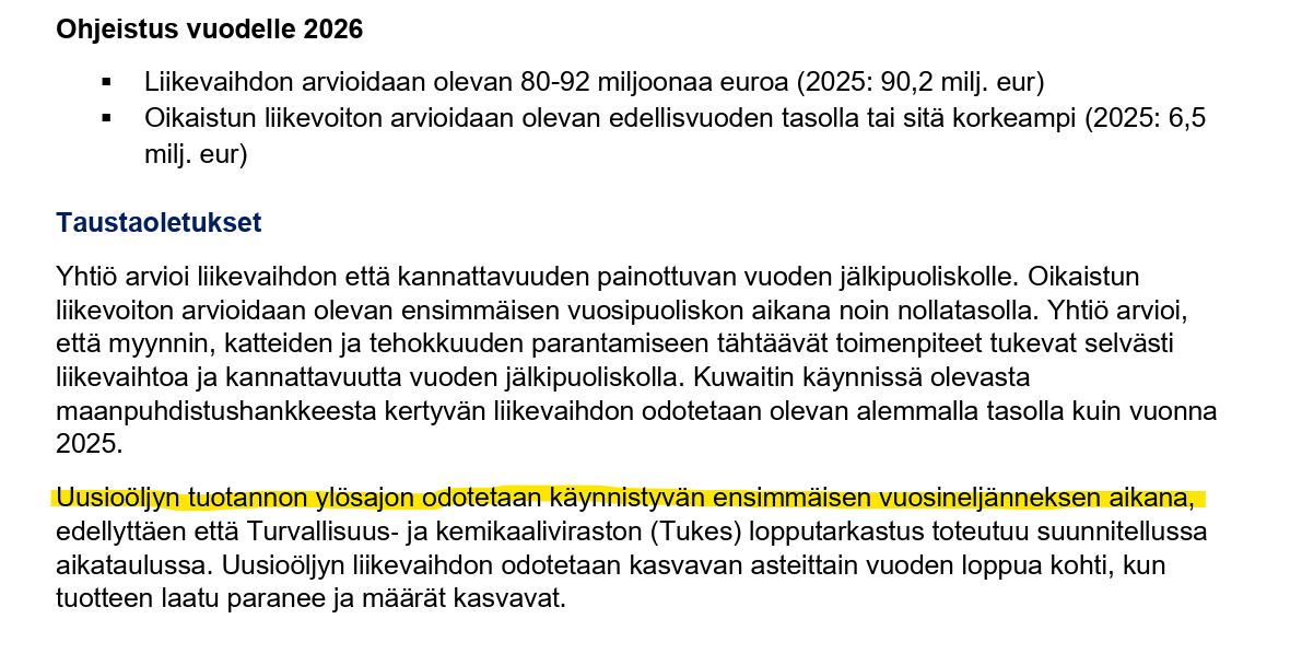Tulosjulkistuksessa CFO kertoi kuitenkin täysin käsittämättömiä faktoja Kilpilahdesta. Vuonna 2026 Kilpilahden laitos on kassavirta- ja EBIT-neutraali harjoitus, ja liikevaihtoa tulee joitakin miljoonia. Jos CFO tähän itse uskoo, suosittelen vahvasti alan vaihtoa kirkolliselle puolelle.
