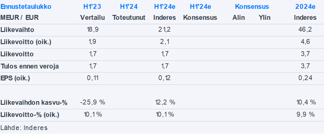 Tältä pohjalta LapWall pääsisi H2:lle vertailukauden tasolla olevalla noin 23 MEUR:n tilauskannalla, mikä taas antaisi yhtiölle mielestämme hyvät lähtökohdat 43-48 MEUR:oon ohjeistetun liikevaihdon ja 4,3-4,8 MEUR:oon ohjeistetun oikaistun liikevoiton saavuttamiseen tänä vuonna. Toimialan volatiiliin luonteeseen peilattuna LapWallin ohjeistushaarukat ovat kapeahkot, joten haarukoihin osuminen ei mielestämme ole täysin varmaa, vaikka ennusteemme ovatkin toistaiseksi suunnilleen haarukoiden keskivaiheilla.