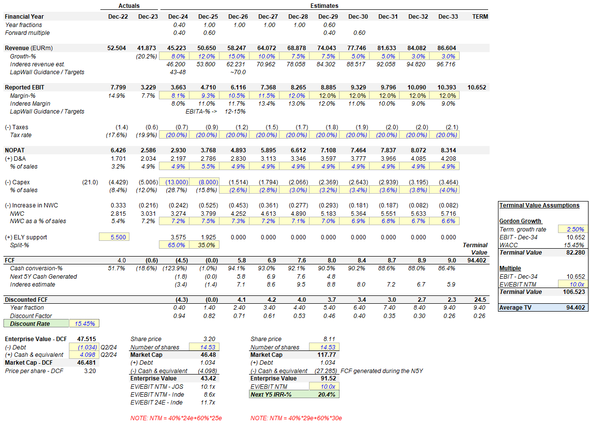 Päivitin tulosjulkaisun jälkeen myös omaa malliani. Mallini perusteella LapWallin tuotto-odotus onkin hyvin mielenkiintoisella tasolla. Vaikka perusolettamani ovat LapWallin omien taloudellisten tavoitteiden ja Inderesin seuraavan seitsemän vuoden estimaattien alapuolella (en ymmärrä, miksi Inderesin DCF:n EBIT-% marginaalit tippuvat merkittävästi vuoden 2028 jälkeen yhtiön skaalan kasvaessa), päädyn LapWallin osalta yli 15 % vuotuiseen tuotto-odotukseen nykyisellä hinnalla (3,20 € per osake). Tämä on mielestäni vähintäänkin kohtuullinen ottaen huomioon riskit, jotka on myös huomioitu mallin odotuksissa.