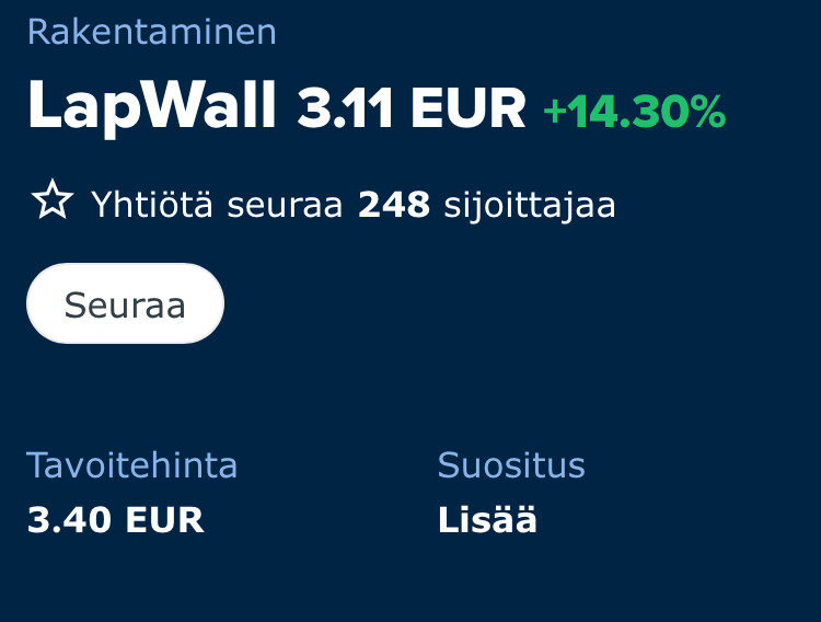 LapWallin tapauksessa minulle oli myös erittäin tärkeää, että listautumishinta on erittäin houkutteleva suhteessa myös mielestäni konservatiivisesti määritettyyn haarukan alalaitaan. Ensimmäisenä pörssipäivänä kurssi nousi noin 15 %, mikä pienensi tuotto-odotusta suhteessa haarukan alalaitaan, mutta se on mielestäni yhä hyvä. Näin ollen lähdin liikenteeseen lisää-suosituksella. Haarukan ylälaita taas kuvaa valuaatiopotentiaalia nykyistä suotuisammassa ja vähäriskisemmässä talouden ja osakemarkkinoiden ympäristössä, mutta näiden tekijöiden varaan en 12 kuukauden tähtäimellä ole kuitenkaan valmis LapWallin osalta laskemaan.