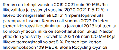 Remeon luvut on vähän sekavat yritysjärjestelyjen myötä, käsitykseni mukaan ihan noin kovaa laskua ei ole ollut. Verdis on tosiaan kasvanut reippaasti ja päässyt kelpo kannattavuutenkin 2024. Alla teksti Remeon osalta laajasta, sieltä sivulta 17 löytyy jätekilpailijoiden kehitystä muutenkin. Sitä en tiedä minkätyyppisiä sopimuksia kukin on voittanut.