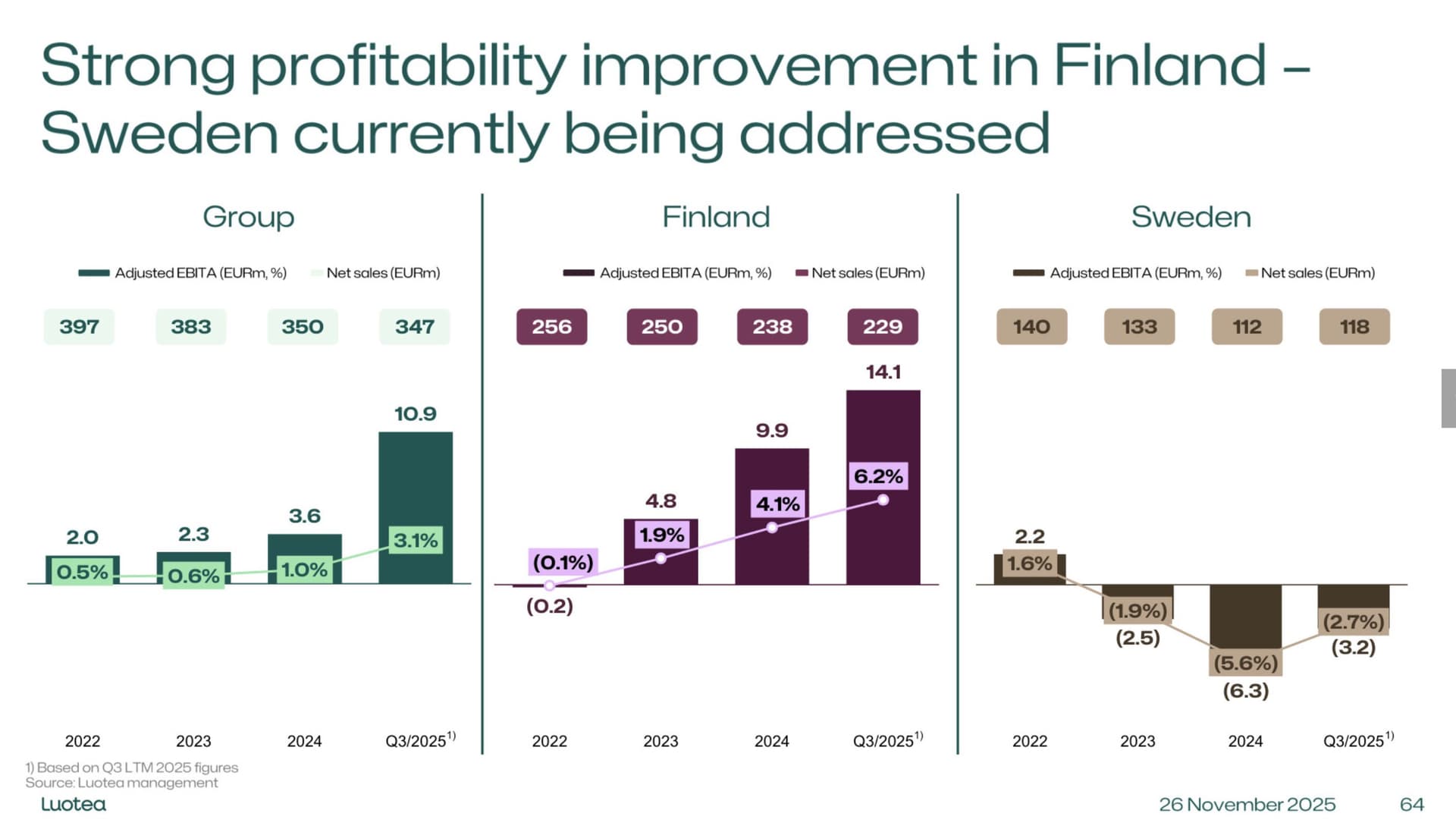 L&T anordnade igår en kapitalmarknadsdag där man presenterade de två bolag som planeras att delas upp vid årsskiftet, det vill säga Luotea och det nya Lassila & Tikanoja. De nya bolagens finansiella mål och strategier hade redan publicerats, så dagen erbjöd inga betydande nyheter. Vad gäller nästa års utsikter fick vi lite mer klarhet kring båda bolagen, men även dessa var i linje med våra förväntningar. Dagen föranleder därför inga behov av prognosändringar, även om vi naturligtvis kommer att utvärdera effekterna av uppdelningen på bolaget när den sannolikt genomförs vid årsskiftet.