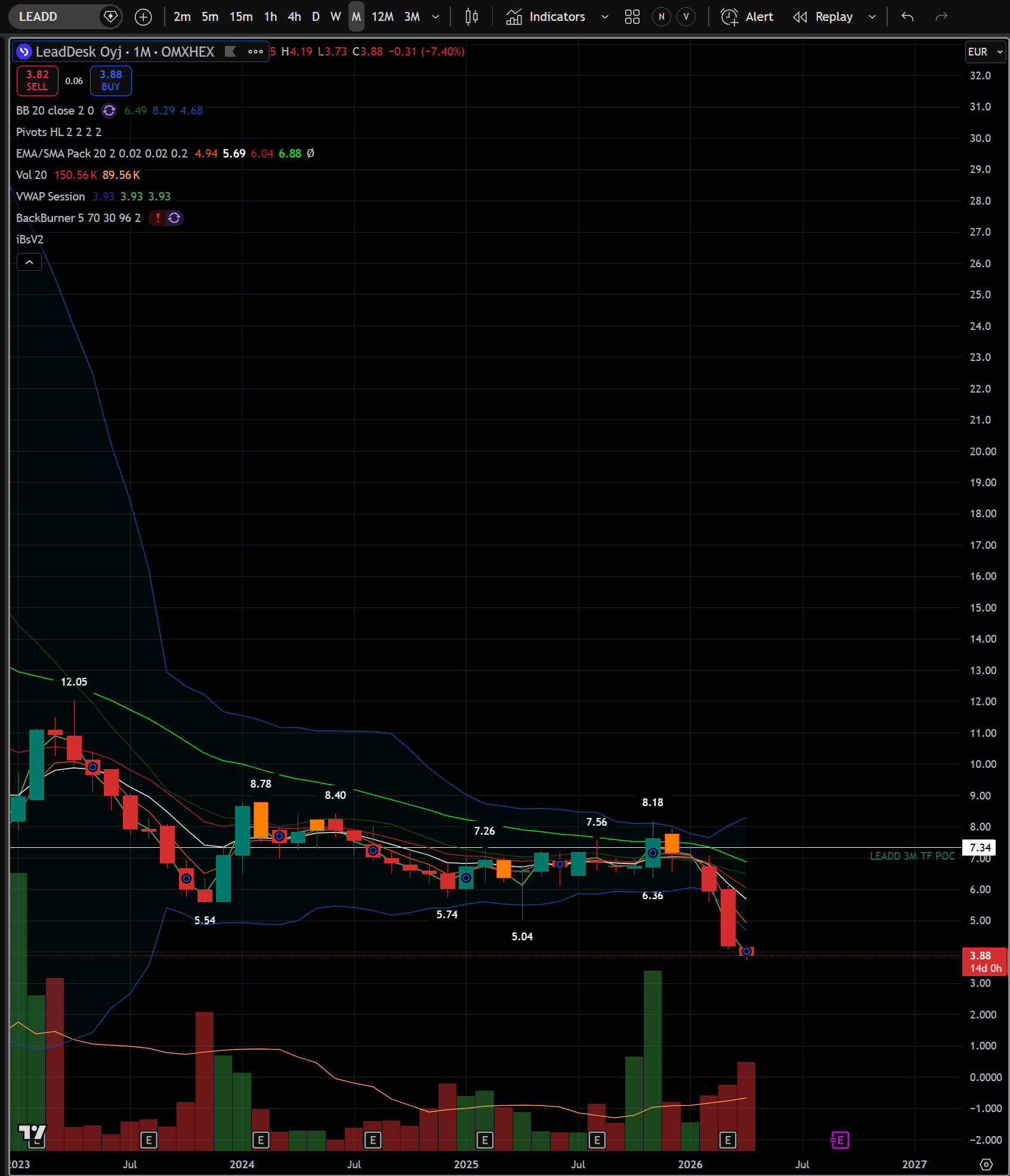 Månedens handelsvolumen er allerede nu på 150k aktier, mens volumen for de tre måneder forud for denne måned var ca. 254k. I det nuværende 6-måneders candle er der stadig 2 måneder og 14 dage tilbage til close, og volumen er allerede på 404,5k aktier. Volumen for de foregående 6 måneder var 707,6k aktier.