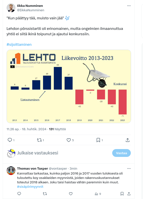 Katsoin aikoja sitten vähän taustoja, Pörssiyhtiö Lehto teki tappiota , ja saman Lehto suvun yhtiöt voittoa ( Lehto Invest ), ja tuli sellainen olo että siinä pyöritetään rinnakkaisbusinesta, Omissa nimissä tehdään voittoa ja pörrsiyhtiön nimissä tappiota. Jos seuraisi rahavirtoja, niin olettaisin että Lehdon suku on myynyt sen verran Lehdon osakkeita hyvään aikaan, että eivät konkurssissa tappiota te, ja todennäköisesti jatkaa rakentamisbusinesta taas jonkun toisen yhtiön nimissä.