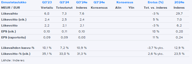 Lemonsoft’s Q3 revenue fell short of our forecast, as organic growth (Q3’24: 1.0%) has not yet picked up quite as expected in our forecast (5%). Profitability, however, exceeded our forecast, and at a quick glance, both the gross margin (87.2%) and the operating expense structure were slightly better than we expected.