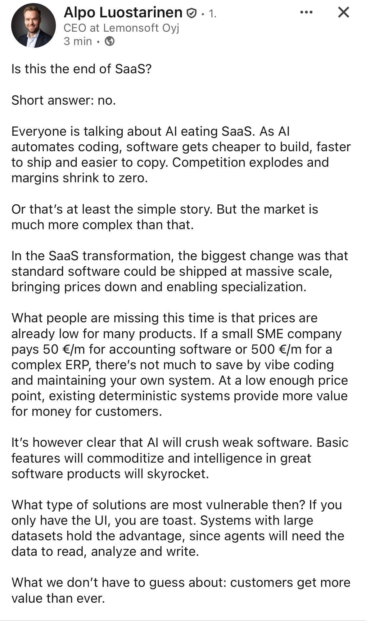 Lemonsoft CEO’s thoughts on the impacts of AI on SaaS companies.
