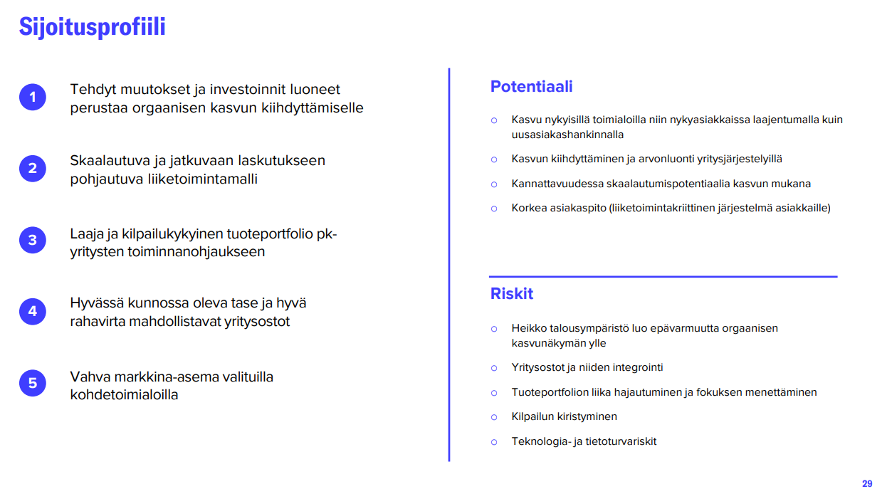 Also in Admicom’s case, changes have still been made in the organization this year, and this has slowed down development. In addition, the change in the billing model is one variable that could somewhat support growth next year. Furthermore, a slight recovery in the construction market would support growth, about which more was written, for example, in the CMD comment published today.