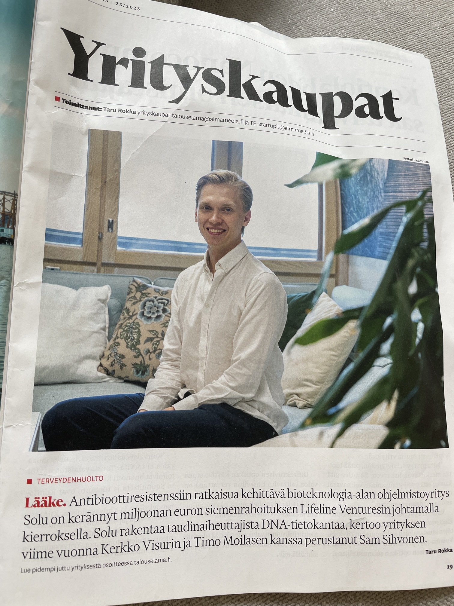 Ja katso. Nappasin lehtikorista random-lukemista ja TaElissa 23/2023 oli oheinen. Jos liite ei nyt jostain syystä näy eli tupeksin kuvan ottamisessa ja/tai liittämisessä, niin kuvateksti on oheinen: ”Antibioottiresistenssiin ratkaisua kehittävä bioteknologia-alan ohjelmistoyritys Solu on kerännyt miljoonan euron siemenrahoituksen Lifeline Venturesin johtamalla kierroksella. Solu rakentaa taudinaiheuttajista DNA-tietokantaa, kertoo yrityksen viime vuonna Kerkko Visurin ja Timo Moilasen kanssa perustanut Sam Sihvonen.