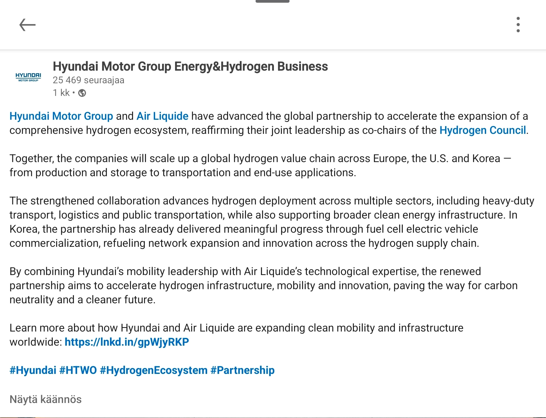 Ja Hyundai+Air Lquide teki maailmanlaajuisen yhteistyösopparin josta odotan kyllä aika isoja tuloksia: