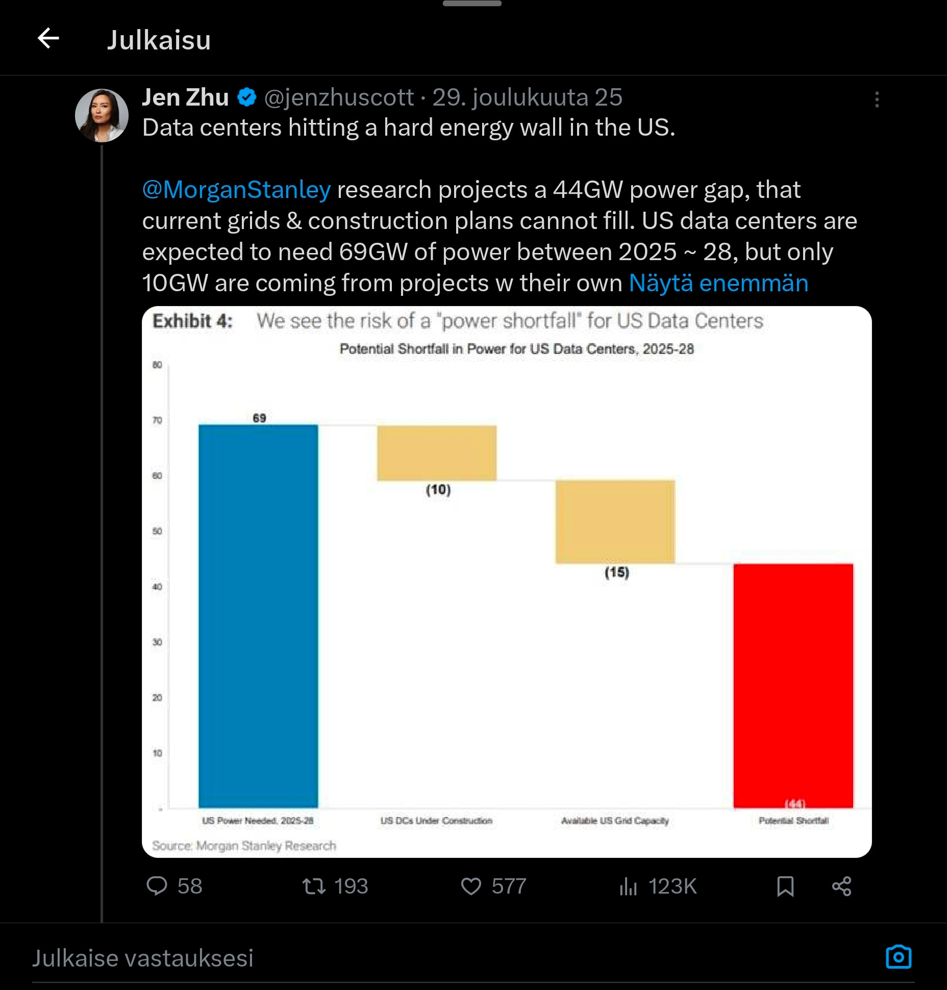 Ja nyt seuraa se tärkeä väittämä → Jenkit valitsee kerta kerrasta sen, että datacenttereillä riittää sähkö vs sähköisen liikenteen. Olisi itseasiassa strateginen virhe, jos jenkit olisi jatkanut tukea akkuautoille, koska se olisi vienyt allikkoon. Ja sama päätös on meillä euroopassa edessä - jos tänne datacenttereitä meinataan rakentaa. Sähköinfra ei vaan tuosta vaan rakennu, ydinvoimaloita ei vaan synny alle 10v, kaasuturbiinimyyjät myy eioota vuoteen -30 asti ja uusiutuvatkin on vähän nyt paineessa.