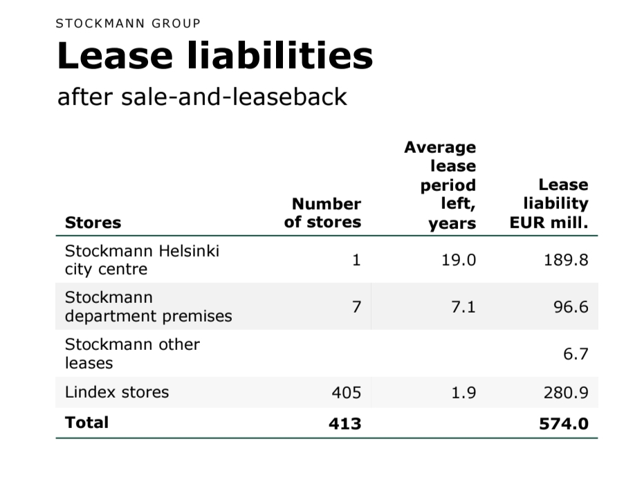 Stockmann’s share is not clear from that. Perhaps some guidance can be obtained from this table presented earlier in the interim report.