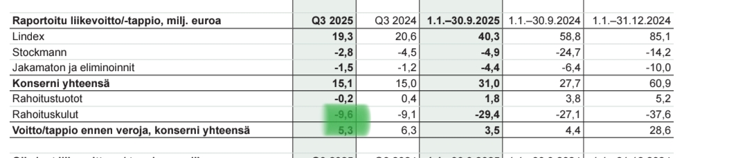 Department stores might even squeeze out a profitable EBIT this year. For department stores, Q1-Q3 EBIT was -9.7 million euros, and last year, EBIT in the last quarter was +10.6 million euros. Of course, financing costs for lease liabilities still need to be deducted from that, but not bad in a very weak consumer market.