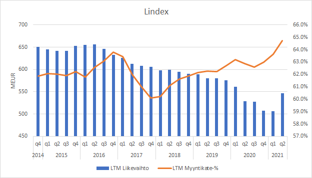 Lindexin kannattavuus on tasaisesti kehittynyt ylöspäin ja tällä hetkellä Lindex on aivan huippuiskussa. Liikevaihto on ollut toistaiseksi vielä tasaisessa laskussa, mutta uskoisin, että nyt lasku alkaa taittumaan, kun vaikuttaa, että huonommin kannattavat liikkeet on pitkälti suljettu ja verkkokauppa on lähtenyt tosissaan vetämään (osuus 19,5 % Q2:lla). Lindexin myyntikatemarginaali on ollut tasaisessa nosussa vuoden 2017 heikomman jakson jälkeen ja vaikuttaa, että siellä on tosissaan tehty oikeita asioita viime vuodet.