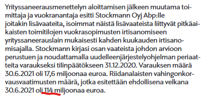 Helsingin käräjäoikeus on 9.2.2021 antamallaan päätöksellä vahvistanut Stockmann Oyj Abp:n saneerausohjelman ja saneerausmenettely on päättynyt. Asianajaja Jyrki Tähtinen määrättiin saneerausohjelman valvojaksi. Saneerausohjelma rakentuu Stockmannin tavarataloliiketoiminnan jatkamiseen, Helsingin, Tallinnan ja Riian tavaratalokiinteistöjen myyntiin ja takaisinvuokraukseen sekä Lindexin liiketoiminnan jatkumiseen kiinteänä osana Stockmann-konsernia.