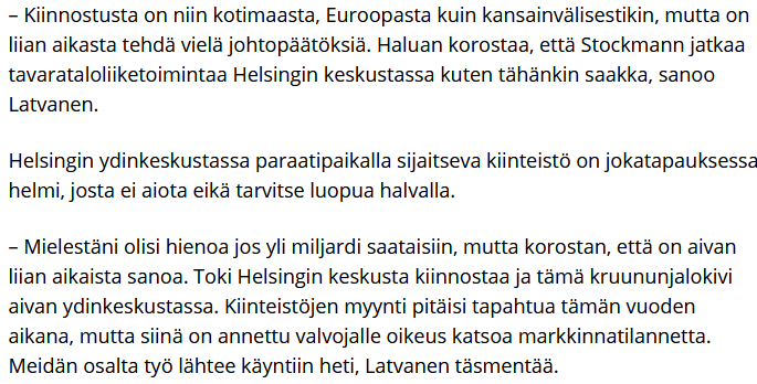 Aika näyttää, mutta mielenkiintoinen keissi tämä on ja itse toivon että Stockmann olisi Helsingin katukuvassa vielä kaukana tulevaisuudessakin.