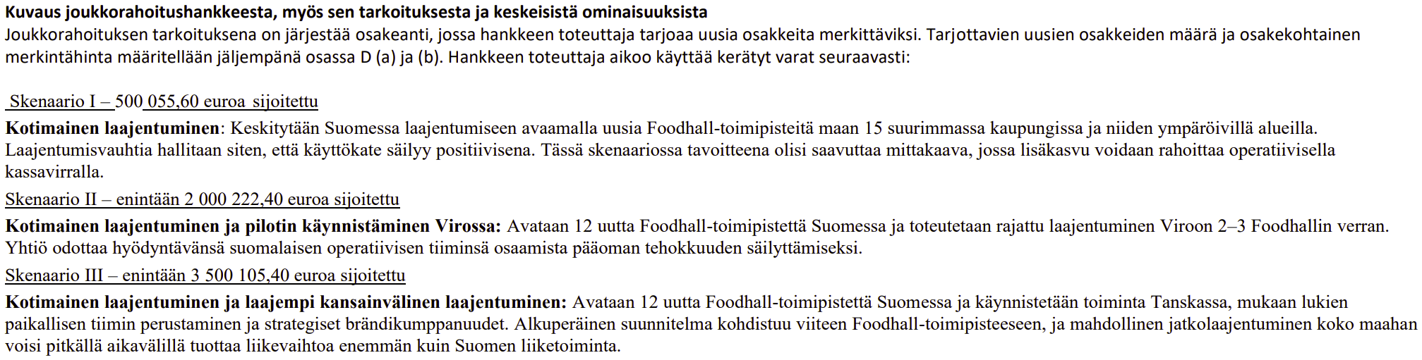 Tulosennuste perustuu 2 ja 3. skenaarioihin. Kakkosmarkkinan jälkeen tavoite olisi nostaa isompi kasvukierros ja avata useampi uusi markkina. Se on meidän primääritavoite. Miten tähän päästään? Suomessa pystymme kasvamaan varsin tehokkaasti, mutta toinen markkina vaatii hieman enemmän kassaa. Riippuen mihin päädytään, tulemme mahdollisesti nostamaan hieman lisää rahoitusta vielä tämän tänään päättyvän Invesdor-kierroksen päälle, jonka avulla saadaan toinen markkina auki. Ehdot voisivat olla samat kuin tällä kierroksella.