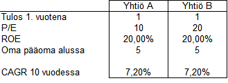 Asiahan voidaan mallintaa. Kuvitellaan kaksi yhtiötä joista toinen on P/E 10 ja toinen P/E 20, mutta jotka ovat muuten ihan samanlaisia, kasvattavat tulostaan joka vuosi 7,2 % ja kaksinkertaistavat siten tuloksensa 10 vuodessa. Kummallakin yhtiöllä on oman pääoman tuotto 20 %.