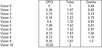 Her antages det, at værdiansættelsesmultiplen ikke ændrer sig, men forbliver den samme. Det udbetalte udbytte er restbeløbet af resultatet efter investeringer. Det antages, at der ikke betales skat af udbyttet. Investeringer er påkrævet for at øge resultatet. Tabellen ser således ud: