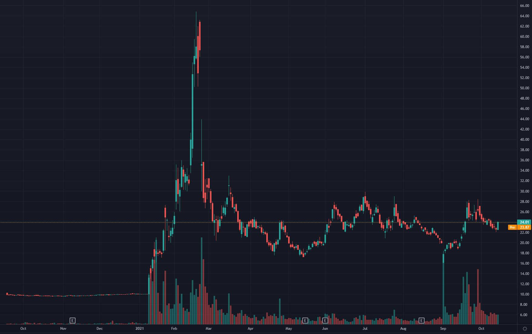 CCIV aikoina itsekin yhtiöön tutustuin ja pitkälti (spac)hypen johdattelemana hyppäsin 14 dollarissa kelkkaan - exit onnenkantamoisella 62 dollarista juuri ennen syöksylaskun alkua.